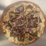 White sauce, mozzarella, chicken, onions, mushrooms, roasted garlic, and tomatoes.