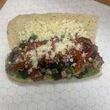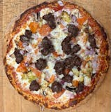 Red sauce, garlic, mozzarella cheese, onions, mushrooms, marinated artichoke hearts, tomatoes, extra cheese and sausage.