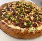 Creamy white garlic sauce, mozzarella cheese, canadian bacon, sausage, bacon, pineapple, and fresh green onions.